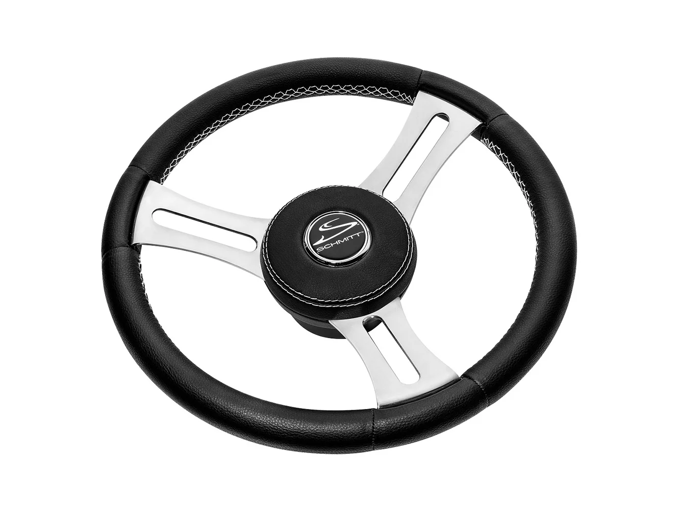 Torcello Elite 14″ Wheel – Black Leather & Cap – White Stitching – Polished SS Spokes – 3/4″ Tapered Shaft