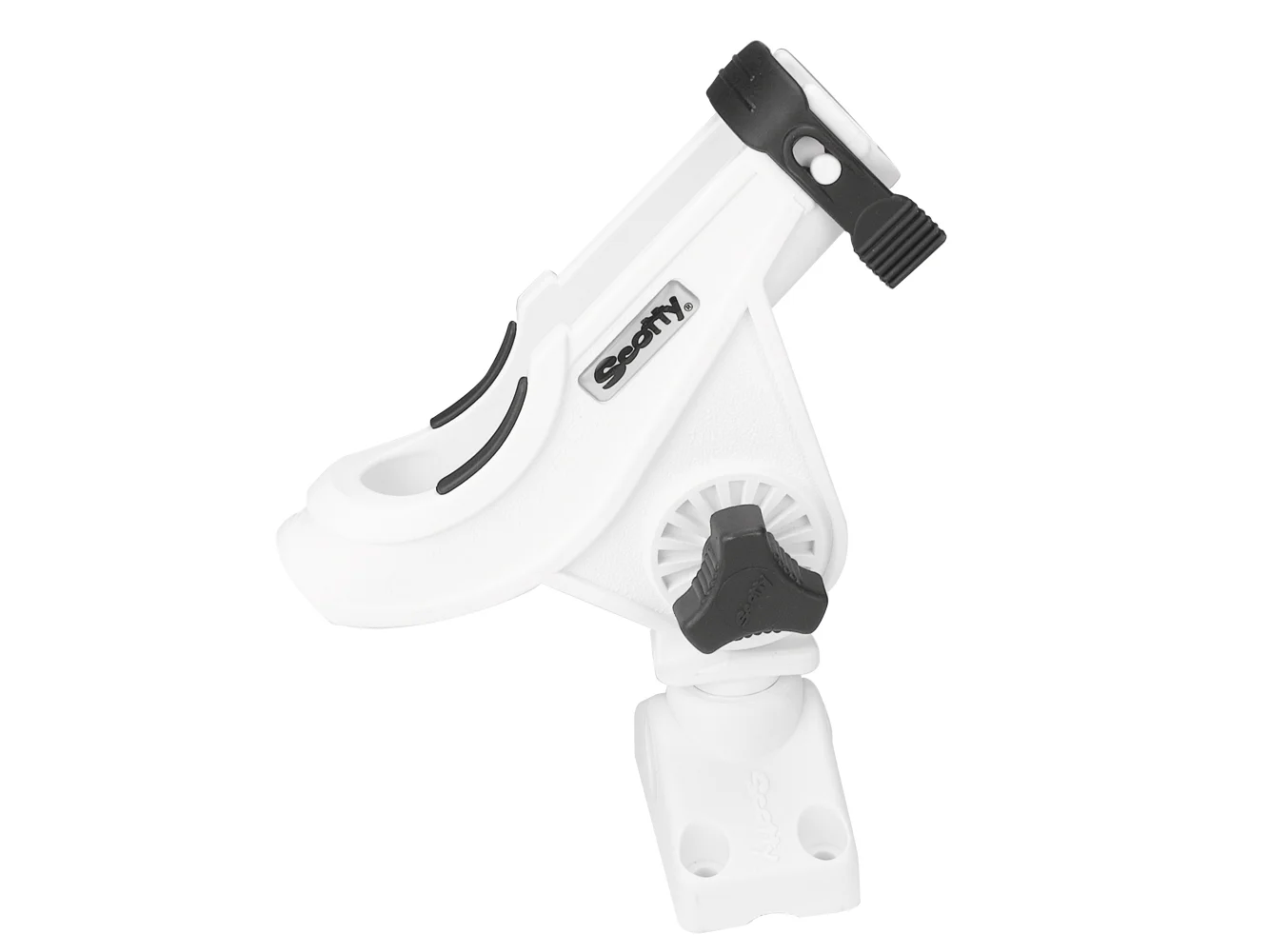 Holds a bait caster reel in a cushioned cradle.A slot in the front of the rod holder allows for a spinning reel to be securely held in position. The rod holder design has a side mounted flange, which leaves the bottom open. This allows for the rod holder to accommodate trigger grips. Pistol grip rod butts easily clear the sides of the rod holder for quick rod retrieval. Rod can be secured in holder with a soft latching strap which snaps over the top.