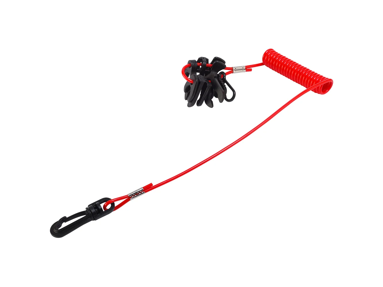 This marine emergency cut-off 10 Key Universal Kill Switch with Lanyard attaches to your life vest while operating a boat or personal watercraft. Designed to instantly cut battery power when detached. Constructed of injection molded nylon and Delrin. The 10 key 50” lanyard fits Johnson, Evinrude, Mercury, Yamaha, Honda, Tohatsu, Suzuki, Kawasaki, OMC, and Nissan kill switches.