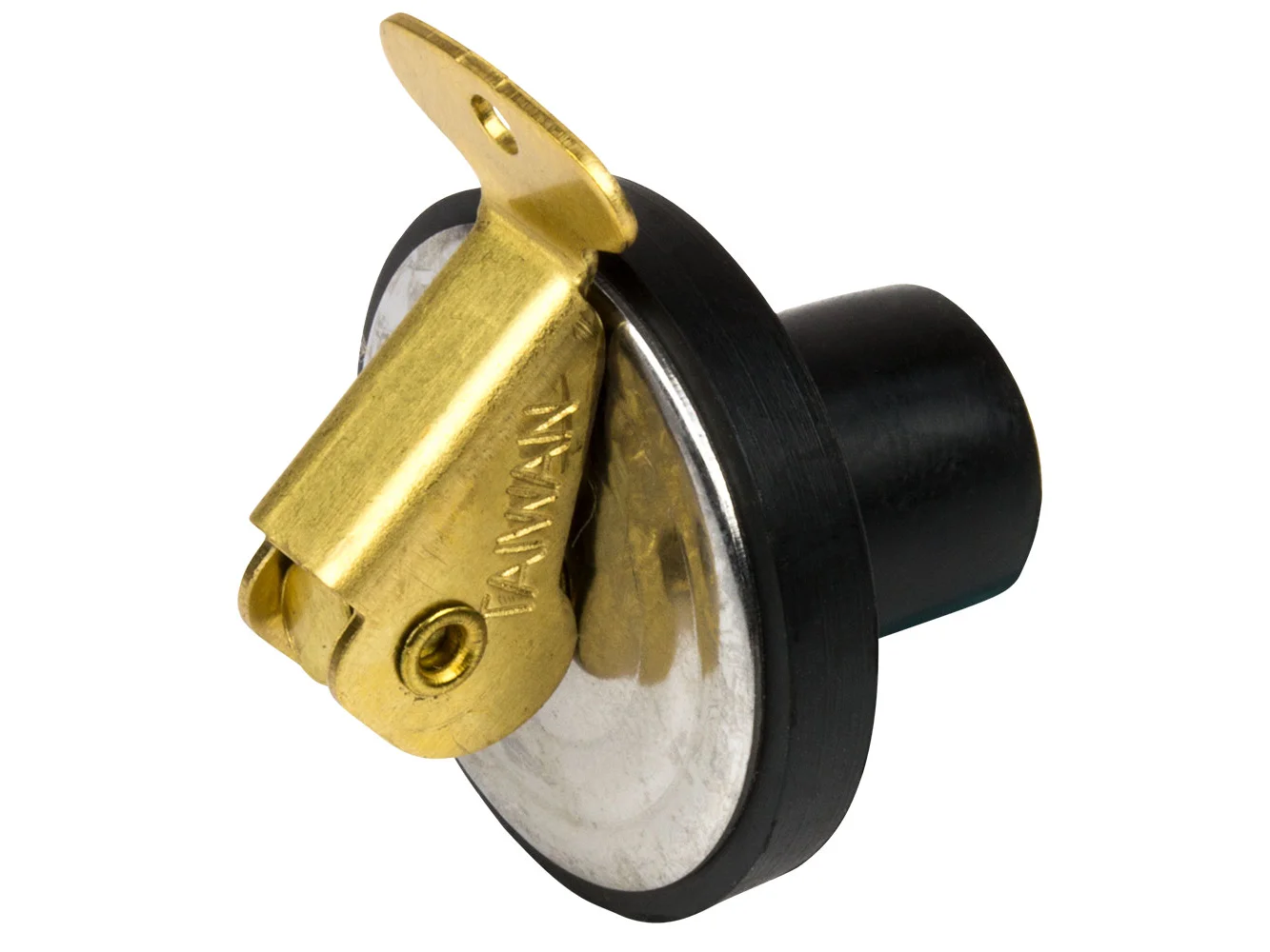 Cam action nitrile rubber plug snaps shut to form a leak-proof seal for livewells and baitwells. Clockwise turn of the handle tightens the plug, brass lever snaps down to lock. Snap lock handle is adjustable to tighten plug size to fit most bait wells currently available.