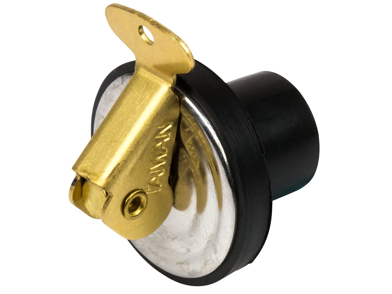 Cam action nitrile rubber plug snaps shut to form a leak-proof seal for livewells and baitwells. Clockwise turn of the handle tightens the plug, brass lever snaps down to lock. Snap lock handle is adjustable to tighten plug size to fit most bait wells currently available.