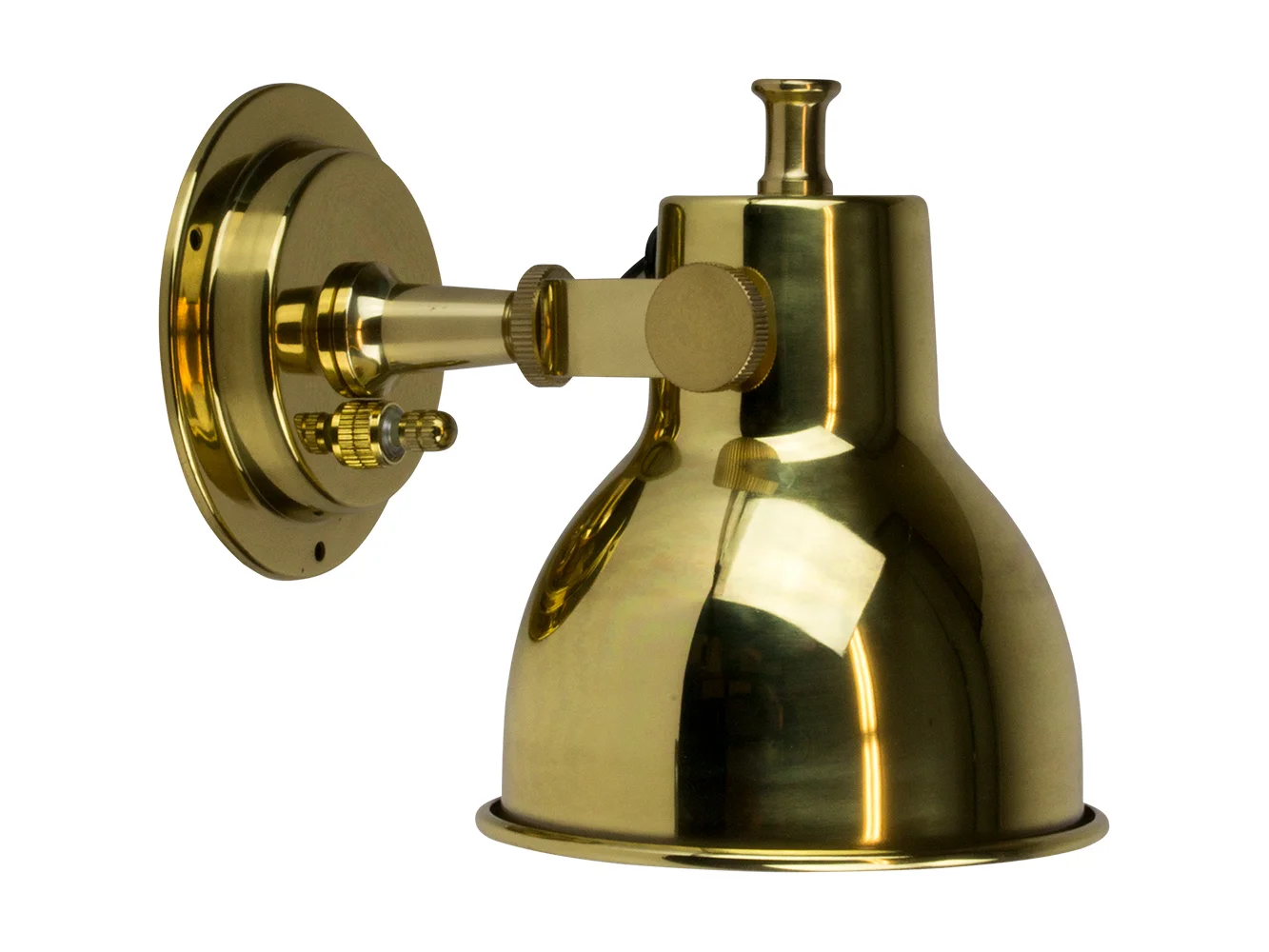 This Berth Light is constructed of machined and stamped brass and a lacquer coating to prevent tarnish with solid brass knurled adjusting knobs. The interior surface of the lamp shade is white enamel to reflect more light. Prewired with integral on/off switch. Includes a 15-watt DC double contact bayonet style bulb. Can be converted to LED with bayonet bulb socket adapter (442042-1) BA150 style base and G4 bulb (sold separately). Designed for bulkhead or wall mounting. Installs with three #6 RH fasteners (not included). 12VDC.