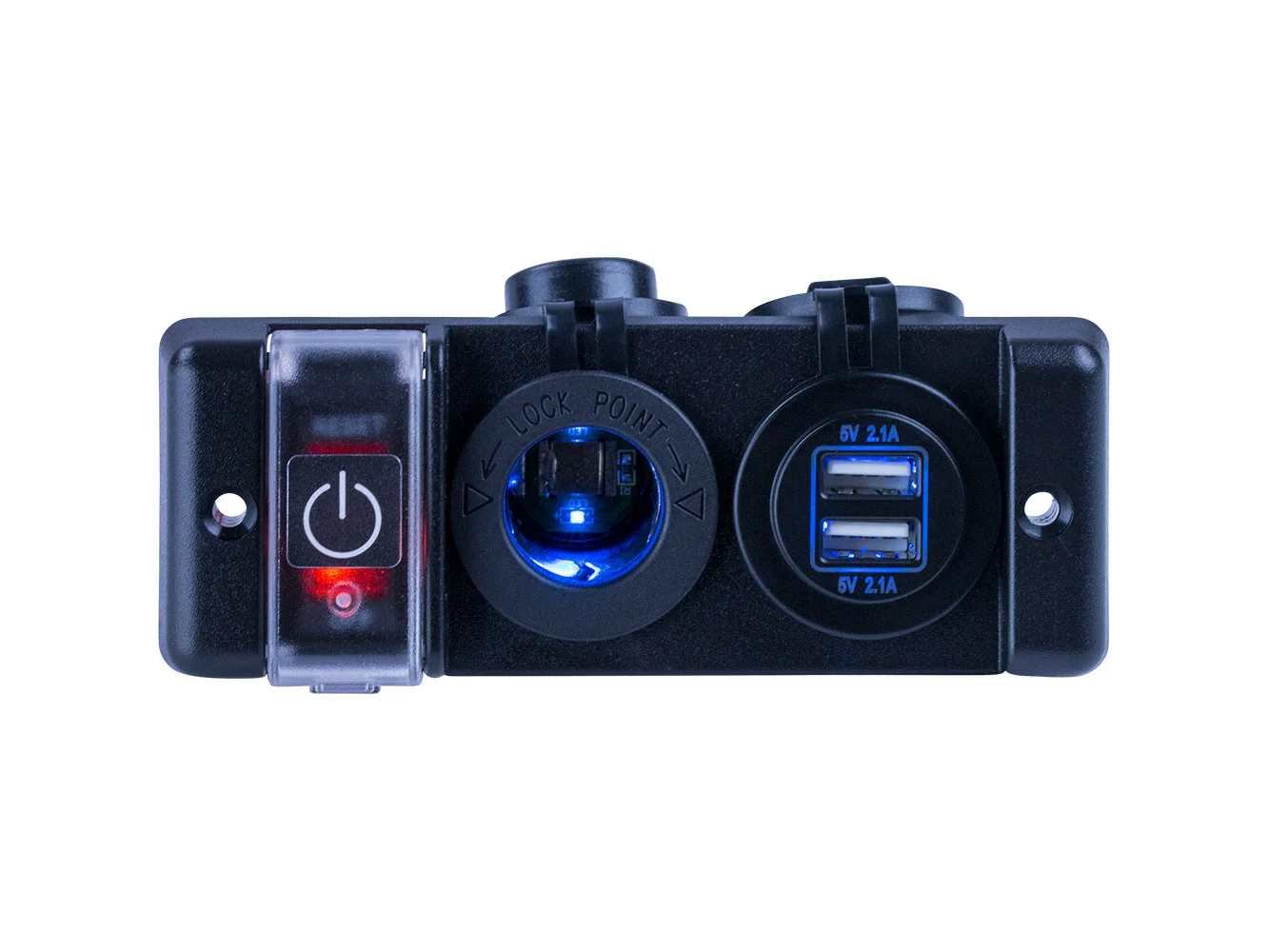 This injection molded nylon power socket panel accommodates both USB connectors as well as standard power sockets. The dual USB power socket charges two devices simultaneously. Input 12V–24V. Single output DC 5V/2.4A. Total output is 4.8A with the load being split between the two sides as needed. Enough power to charge iPhones, iPads and most other devices. The power socket is rated at a maximum of 12V/16A. Protective dust caps extend the life of the charger. Includes mounting screws and electrical connectors. Includes 16A breaker switch.