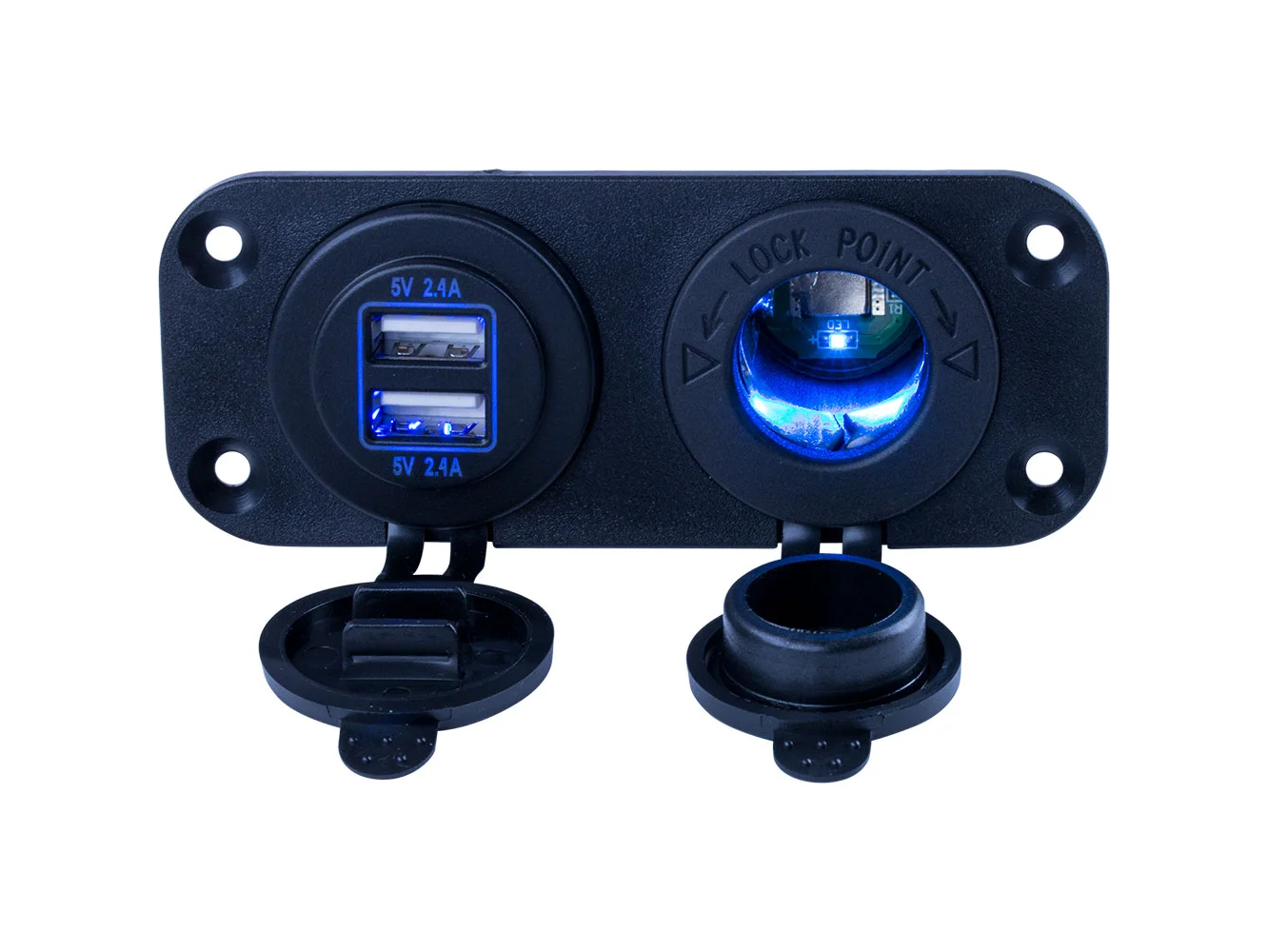 This injection molded nylon power socket panel accommodates both USB connectors as well as standard power sockets. The dual USB power socket charges two devices simultaneously. Input 12V–24VDC. Single output DC 5V/2.4A. Total output is 4.8A with the load being split between the two sides as needed. Enough power to charge iPhones, iPads and most other devices. The power socket is rated at a maximum of 12V/16A. Protective dust caps extend the life of the charger. Includes mounting screws and electrical connectors.