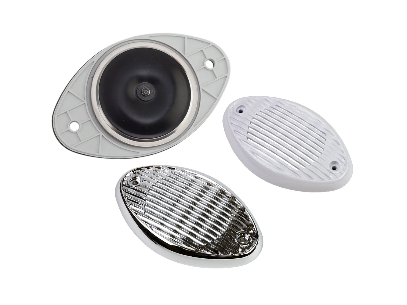 Drop-In Hidden Horn V.3 with Grills is constructed of powder coated steel and injection molded nylon. Kit includes horn plus one chrome and one white decorative billet screw-in grill. Hole size 2-3/4” diameter. At 111 decibels and a frequency (Hz) of 370±20A, this horn meets US Coast Guard’s COLREGS and ABYC standard A-23 for use on vessels under 12m (39′). 12VDC. NMMA Type Accepted #2577066.