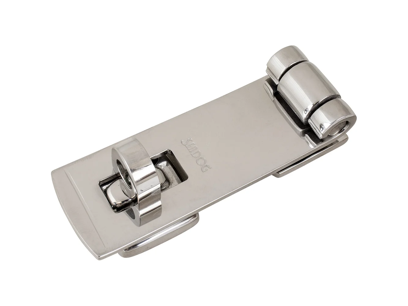 These Heavy Duty Swivel Hasp is designed with a slotted plate that fits over a swivel pad eye. The swivel eye rotates, acting as a temporary lock, but will also accept most padlocks for more permanent protection. The flush mounting plate is hidden when the hasp is closed. Ideal for securing lockers, cupboards, chests, or hatch doors. Constructed of corrosion-resistant Cast 304/316 stainless steel. Installs with four #8 FH fasteners (not included).
