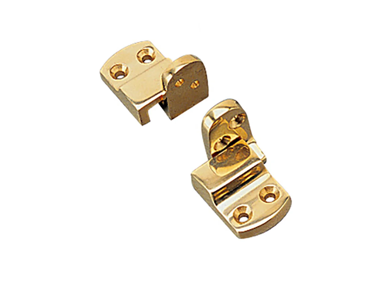 These highly polished Ladder Locks are commonly used with wooden step ladders. Ladder slips into tapered locks and becomes secure as it is lowered in to place. Constructed of cast brass with a plain finish. Installs with eight #10 FH fasteners (not included).