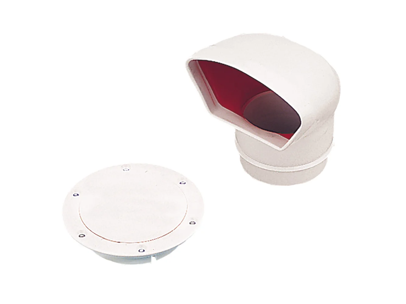 Low Profile Cowl Vents are designed for air intake or cabin ventilation when used in conjunction with a dorade box. Great for bilge ventilation with or without a blower. Ideal for applications where a taller vent would foul lines or restrict crew movement. Includes snap-on deck plate and cover for use in rough weather. Constructed of UV-resistant dip-molded PVC. Available with a white or traditional red interior. Avoid contact with acetone or strong solvents.