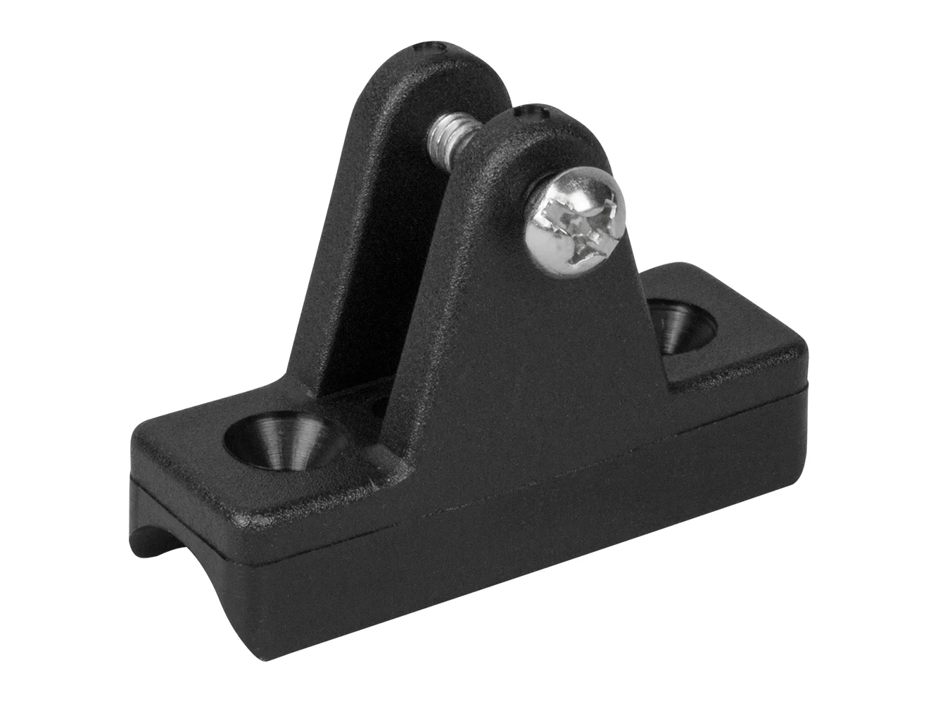 Deck Hinges are designed to mount horizontally and attach an eye end secured to tubing in Bimini top applications. Concave Hinges are designed to rail mount on 7/8” tubing. Angled Hinges are used for mounting items on slanted surfaces like sloped gunwales. 3/16” pin size. Constructed of UV stabilized injection molded nylon. Installs with two #10 FH fasteners (not included). Available in black or white.
