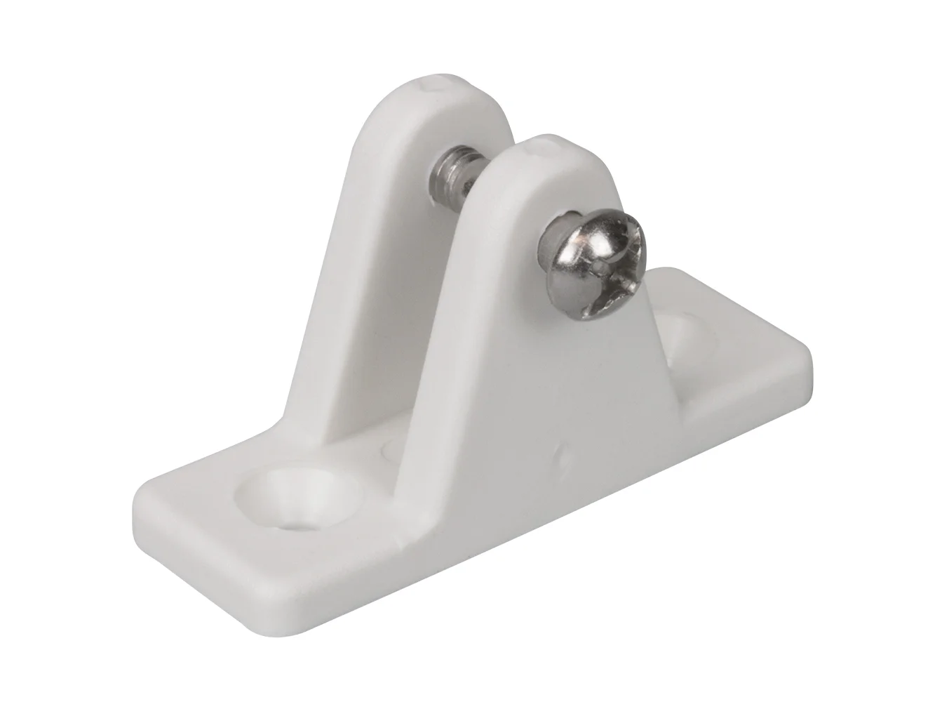 Deck Hinges are designed to mount horizontally and attach an eye end secured to tubing in Bimini top applications. Concave Hinges are designed to rail mount on 7/8” tubing. Angled Hinges are used for mounting items on slanted surfaces like sloped gunwales. 3/16” pin size. Constructed of UV stabilized injection molded nylon. Installs with two #10 FH fasteners (not included). Available in black or white.
