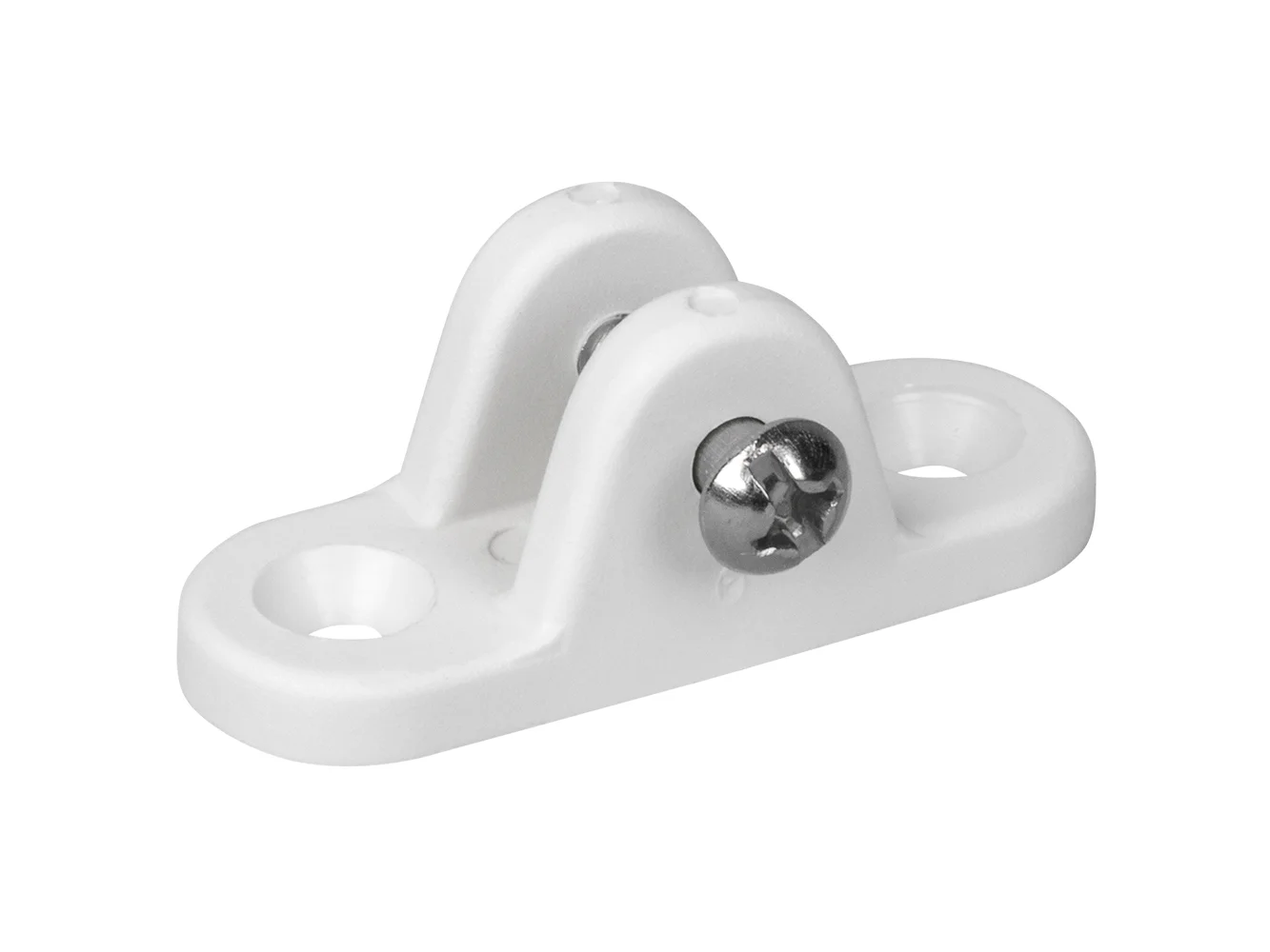 Deck Hinges are designed to mount horizontally and attach an eye end secured to tubing in Bimini top applications. Concave Hinges are designed to rail mount on 7/8” tubing. Angled Hinges are used for mounting items on slanted surfaces like sloped gunwales. 3/16” pin size. Constructed of UV stabilized injection molded nylon. Installs with two #10 FH fasteners (not included). Available in black or white.