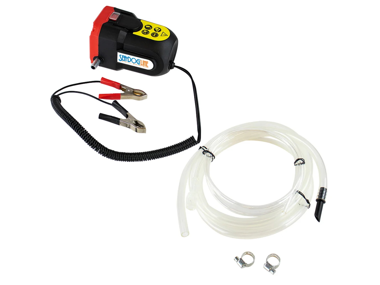 This portable, lightweight Premium Electric Oil Pump is easy to use and transport. The self-priming 12V pump attaches to battery terminals with alligator clips and drains oil through the dipstick tube on outboards and sterndrives. Convenient DIY operation saves money on expensive oil changes. Its compact size makes it is easy to store. Includes 48” inlet and 80” outlet hoses. 12VDC. 60W. Maximum run time: 30 minutes. NOT intended for commercial use. NOT suitable for pumping out transmission oil, water, or flammable liquids.
