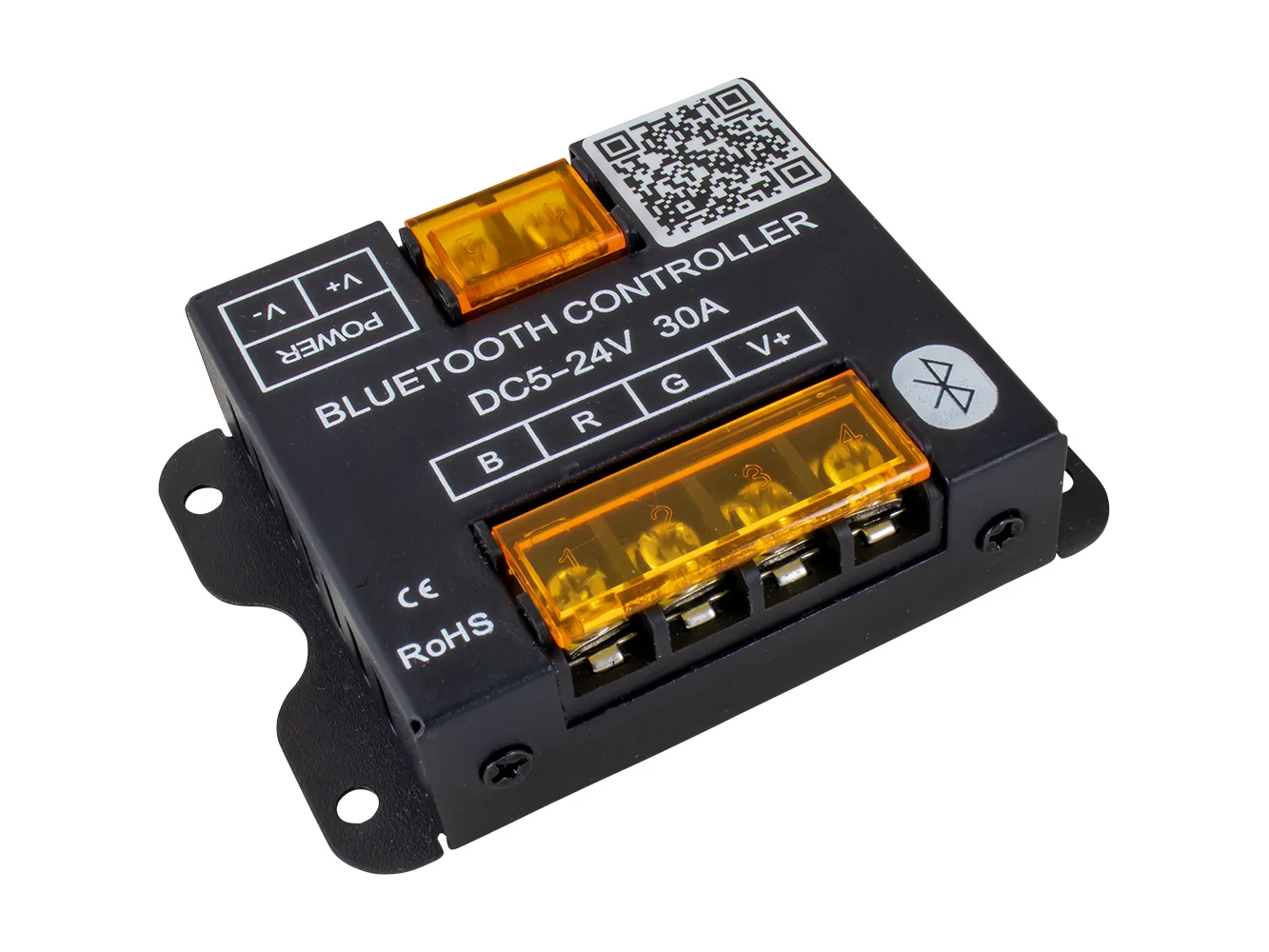 Using Bluetooth technology, this RGB LED controller lets you operate LED RGB Rod holders (325181), LED RGB Tube inserts (325189), LED RGB Rod holder caps (325188), and LED RGB strips lights with your smartphone (IOS 6 or Android 4.0 and above). Choose from numerous dynamic color-changing modes with adjustable speed and brightness levels or from static color modes. Additional features include a color-selection wheel, 6 timer settings, music control, mode/color-change via phone shake, and photo color match (matches specific colors in photos). This LED controller has a maximum load capacity of 10 amps per channel and is compatible with LED light strips that operate within a 5-24 VDC range. The maximum load is 400 watts at 12 volts or 800 watts at 24 volts. The controller works within 50′ of your phone. For dry locations only. CE, RoHS compliant.