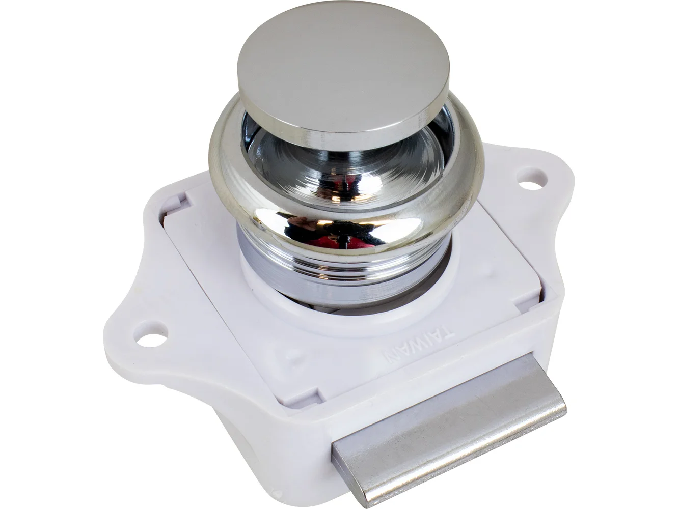 Push Button Rim Latch housings feature a streamlined, positive-action closure, ensuring cabinets and drawers stay closed until the button is deliberately pushed. Suitable for left-side or right-side use. Mortise mount for a sleek, finished appearance. Constructed of sturdy plastic with a chrome plated or polished brass knob. Latch installs with two #6 RH fasteners, strike plates require two #4 FH fasteners (fasteners not included). Display version comes with both flat and 90° strike plates for inset or overlay mounting. When ordering bulk, please order strike plates (224320 flat, or 224321 90°) separately. Hole spacing on flat strike plate (224320) is 1-7/8". Hole spacing on 90° strike plate (224321) is 1-3/16". For OEM applications, varying combinations of rosettes/buttons are available.