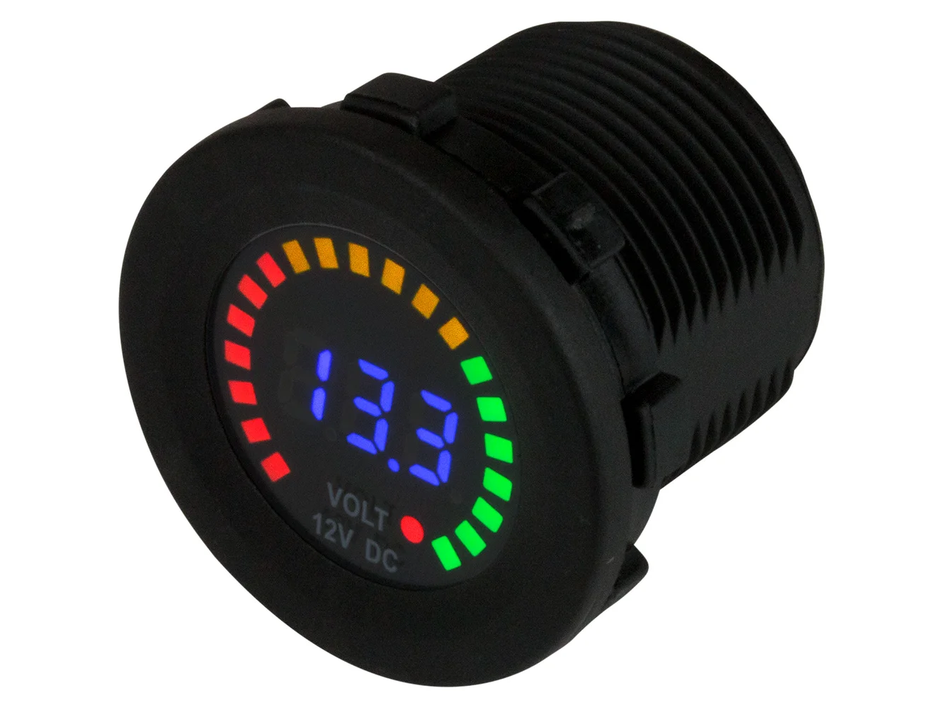 The Rainbow Display Digital Voltmeter gives the user quick, visual, color-coded voltage information. Red/orange means the voltage is too low. Green means the voltage is normal. The same compact round size as a standard 12VDC receptacle, this voltmeter supports many installation options. Constructed of injection-molded nylon. Rainbow LED display. For use with 12VDC systems. IP65 rating.
