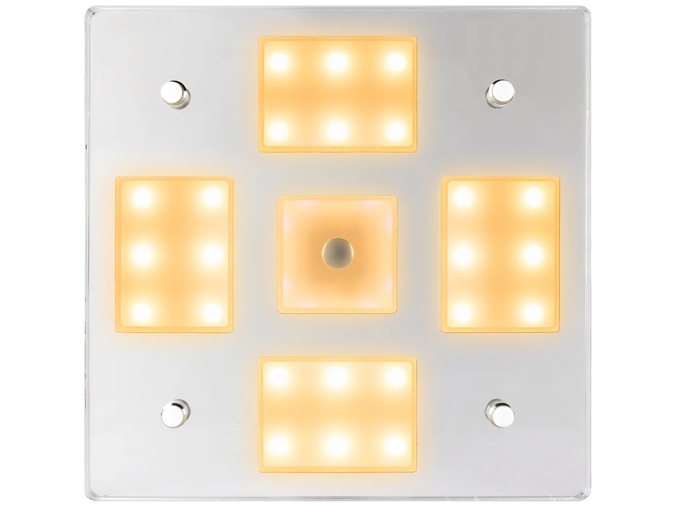 This LED Square Mirror Light features white and blue LED lights with a built-in, touch-controlled on/dim/off switch. Touch the center button to switch between white, blue, and off. Continue to touch the button to activate the dimmer.