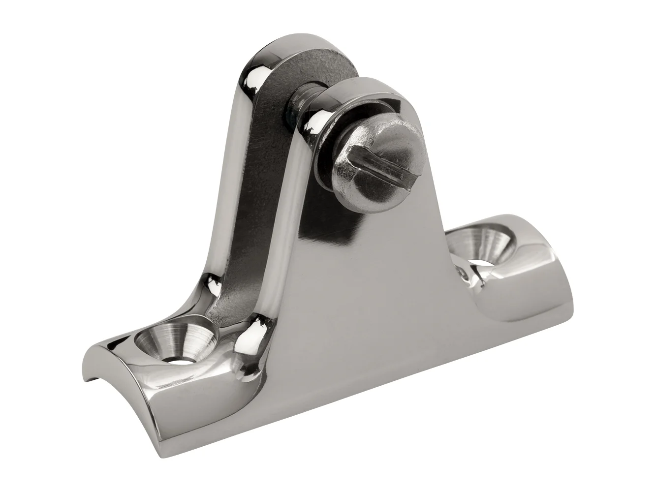 Deck Hinges are designed to mount horizontally and attach an eye end secured to tubing in Bimini top applications. Concave Hinges are designed to rail mount on 7/8” tubing. Angled Hinges are used for mounting items on slanted surfaces like sloped gunwales. 3/16” pin size. Constructed of UV stabilized injection molded nylon. Installs with two #10 FH fasteners (not included). Available in black or white.