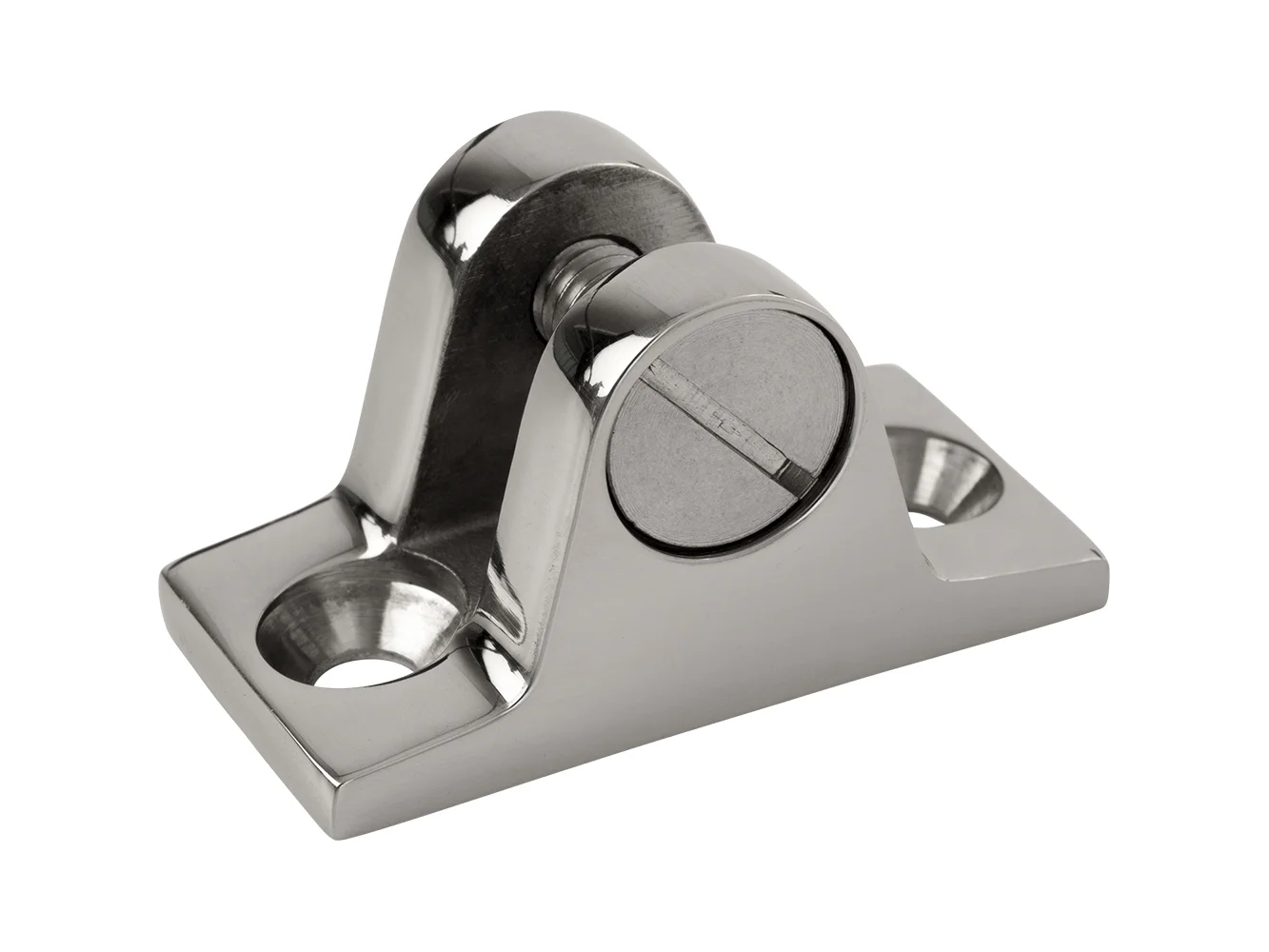 Deck Hinges are designed to mount horizontally and attach an eye end secured to tubing in Bimini top applications. Concave Hinges are designed to rail mount on 7/8” tubing. Angled Hinges are used for mounting items on slanted surfaces like sloped gunwales. 3/16” pin size. Constructed of UV stabilized injection molded nylon. Installs with two #10 FH fasteners (not included). Available in black or white.
