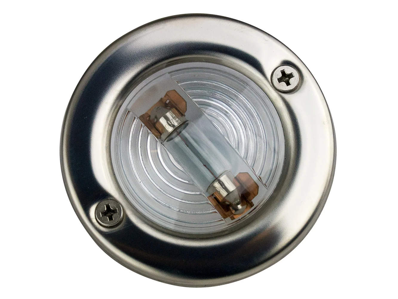 Round Transom Light is constructed of stamped 304 stainless steel. For replacement of existing lighting (not for new construction). Installs with two #8 FH fasteners (not included).
