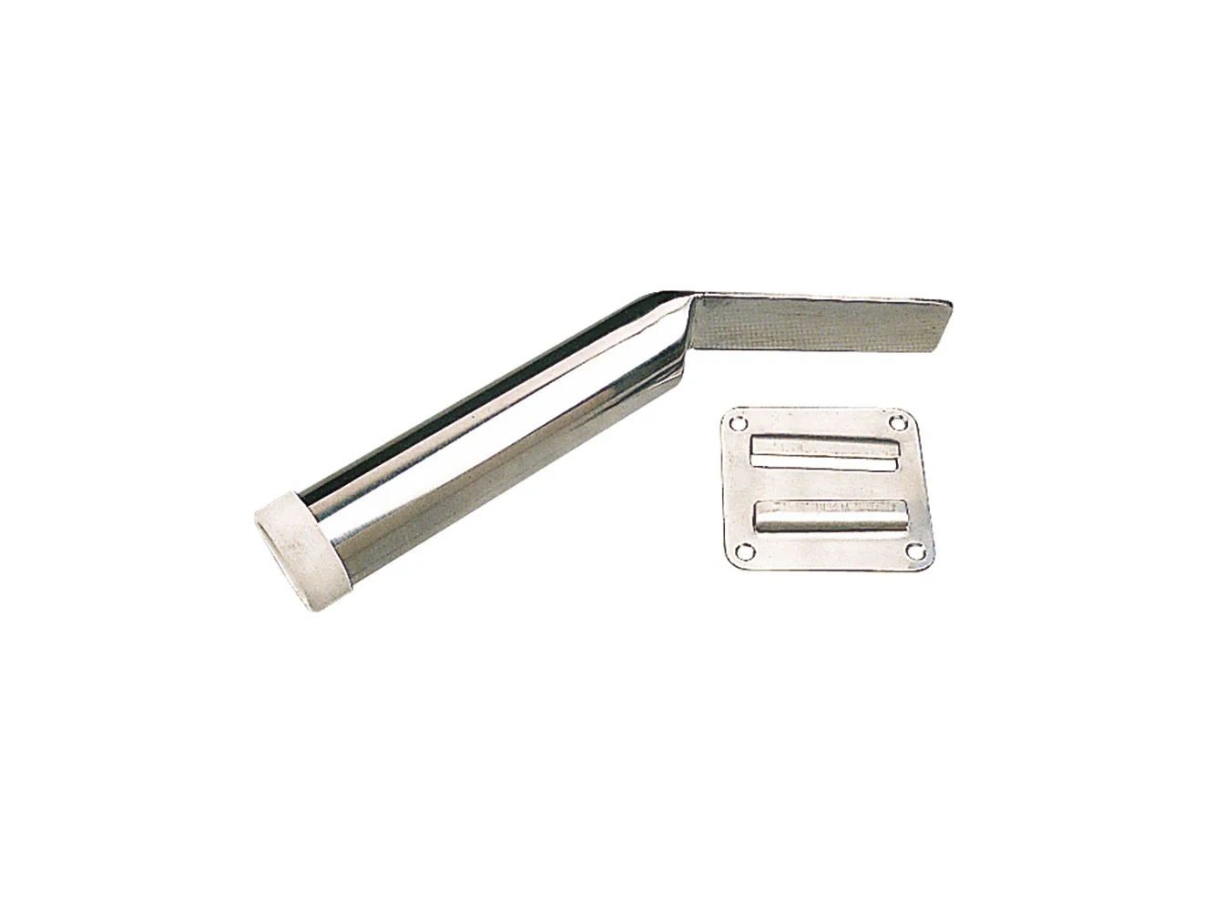 Side Mount Rod Holder slides in and out of mounting plate for a lower profile while not in use. Constructed of formed 316 stainless steel with mounting plate. Features a 30° angle. Accommodates rods up to 1-13/16”. Installs with four #10 FH fasteners (not included).