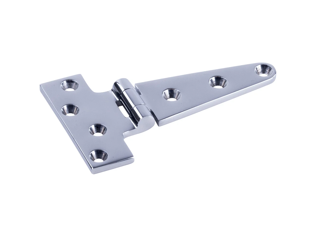 A T-Hinge is a hybrid combination between a butt and strap hinge. The horizontal part of the T goes on the frame, while the vertical part is fastened to the door or cabinet and is visible when closed. This highly decorative and functional hinge is flush mounted (not recessed) and can be used on doors, cabinets, dock boxes, ice chests, etc. Constructed of corrosion resistant investment cast 316 stainless steel. Installs with seven FH fasteners (not included).