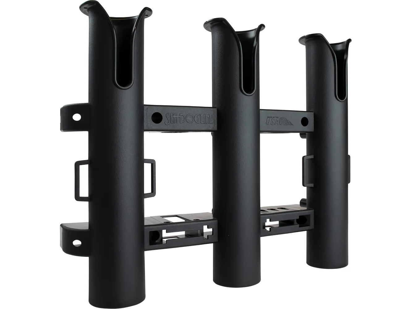 The Triple Threat™ Three Pole Rod Holder is made in the USA with recycled materials. Features the ability to hold bait, cast, and fly-fishing rods/reels. This three-pole, side-mount rod holders come equipped with a built-in knife and plier storage with holders that can accommodate up to 16 different fishing lures. Constructed of one-piece injection molded, UV stabilized, polypropylene construction. No assembly is required. This is a fisherman’s dream and is a must-have for any boat, kayak, or dock!
