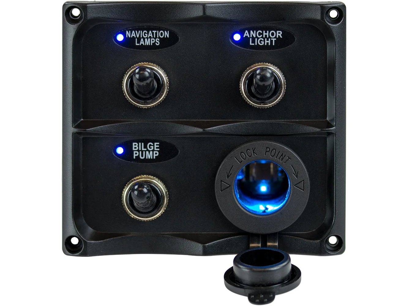 Water Resistant Toggle Switch Panel is constructed of injection molded ABS and polycarbonate. Features three 15A 12VDC toggle switches with blue LED indicator lights, blue LED lighted power socket, ATC fuse holders, and decal sheet. Rated IP66.