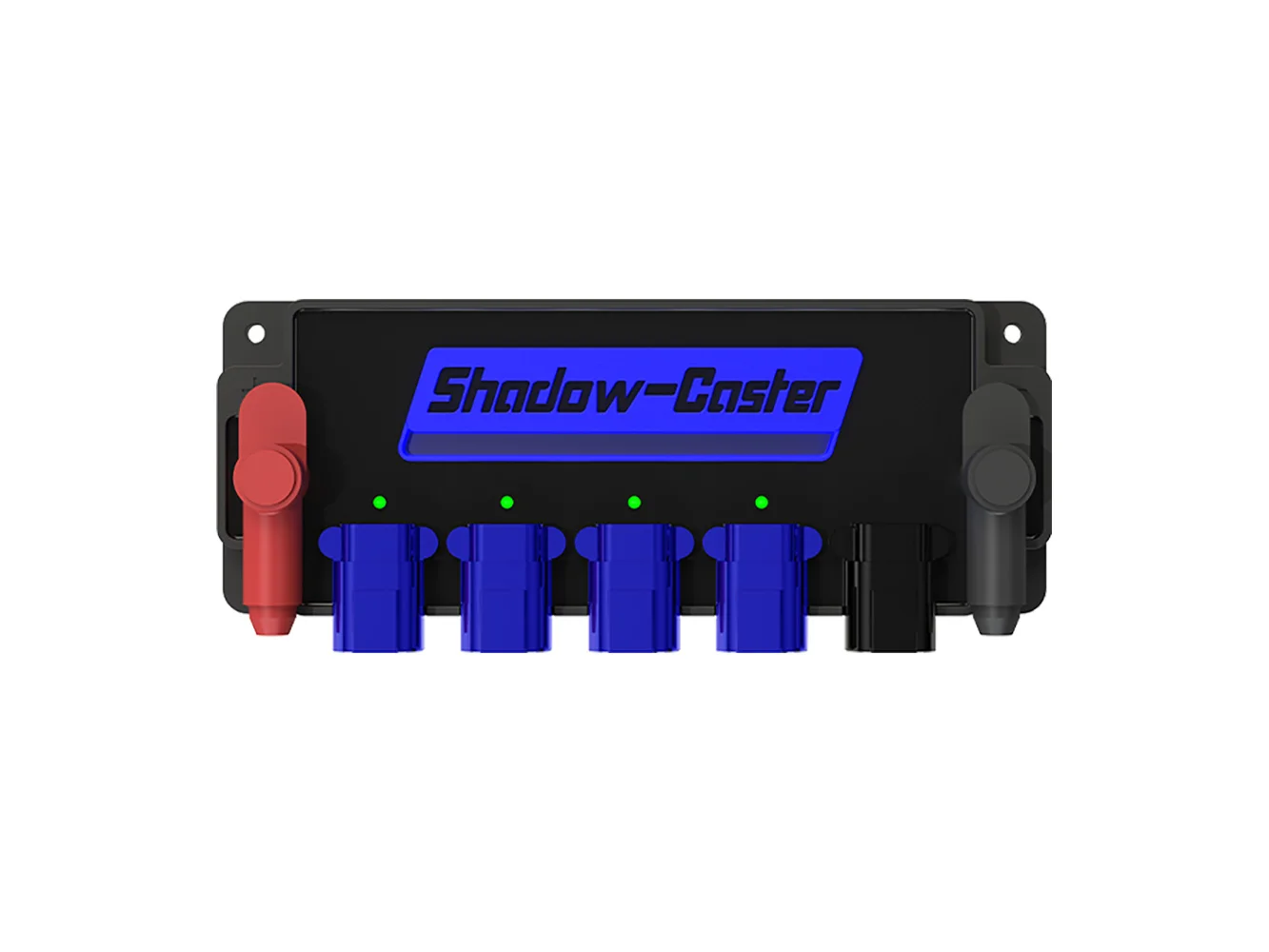 The SCM-PD4CH is a 4-position power distribution box that provides a convenient way to connect up to 4 Shadow-Caster™ underwater lights. Digital over-current protection for each output ensures the safe operation of multiple lights and provides an easy way to manage the relatively high current switching needs of multiple light installations.