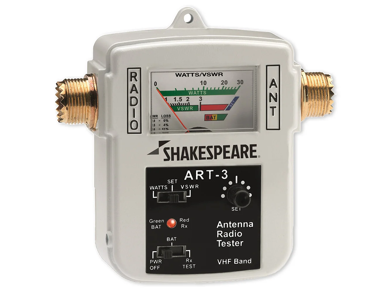 No need to call for a radio check when you have this compact, easy to use, unit on-board. Unlike other meters in its class, the ART-3 tests receiver function as well as output power and VSWR (antenna efficiency). It is powered by an internal battery or can be connected to ships 12 VDC with the supplied power cable. Battery level can be checked at the flip of a switch. No serious boater should be without an ART-3.