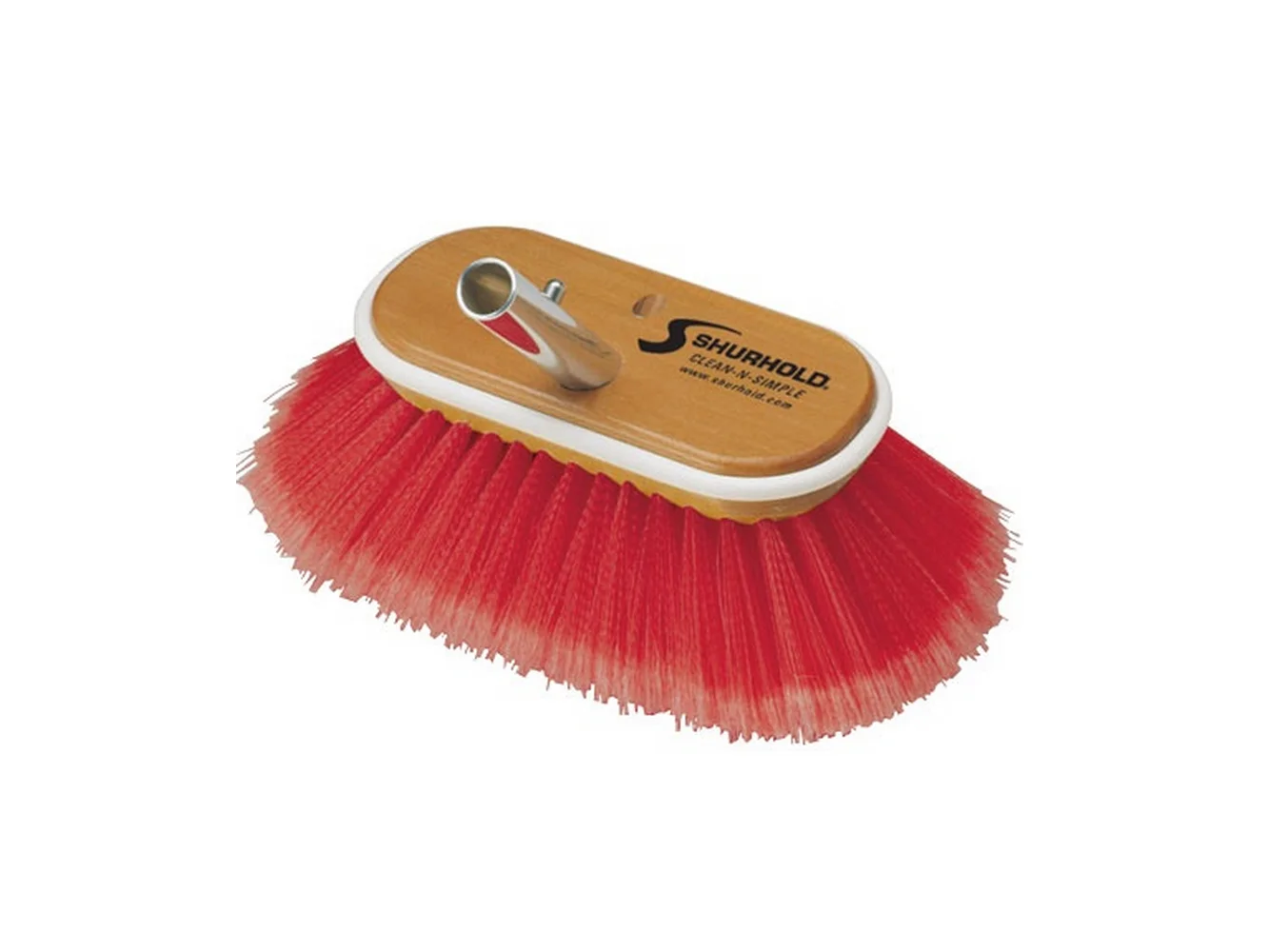 Now you can clean with just one brush. The Shurhold combo deck brush is perfect for gentle washing along with areas that require more effort. The combo deck brush features longer soft fibers for washing, and medium short fibers for scrubbing. As you push down harder on stubborn spots, the stiffer fibers take over. As with all Shurhold brushes, this combo deck brush easily snaps into any Shurhold handle and features solid wood block and rubber wraparound bumper.