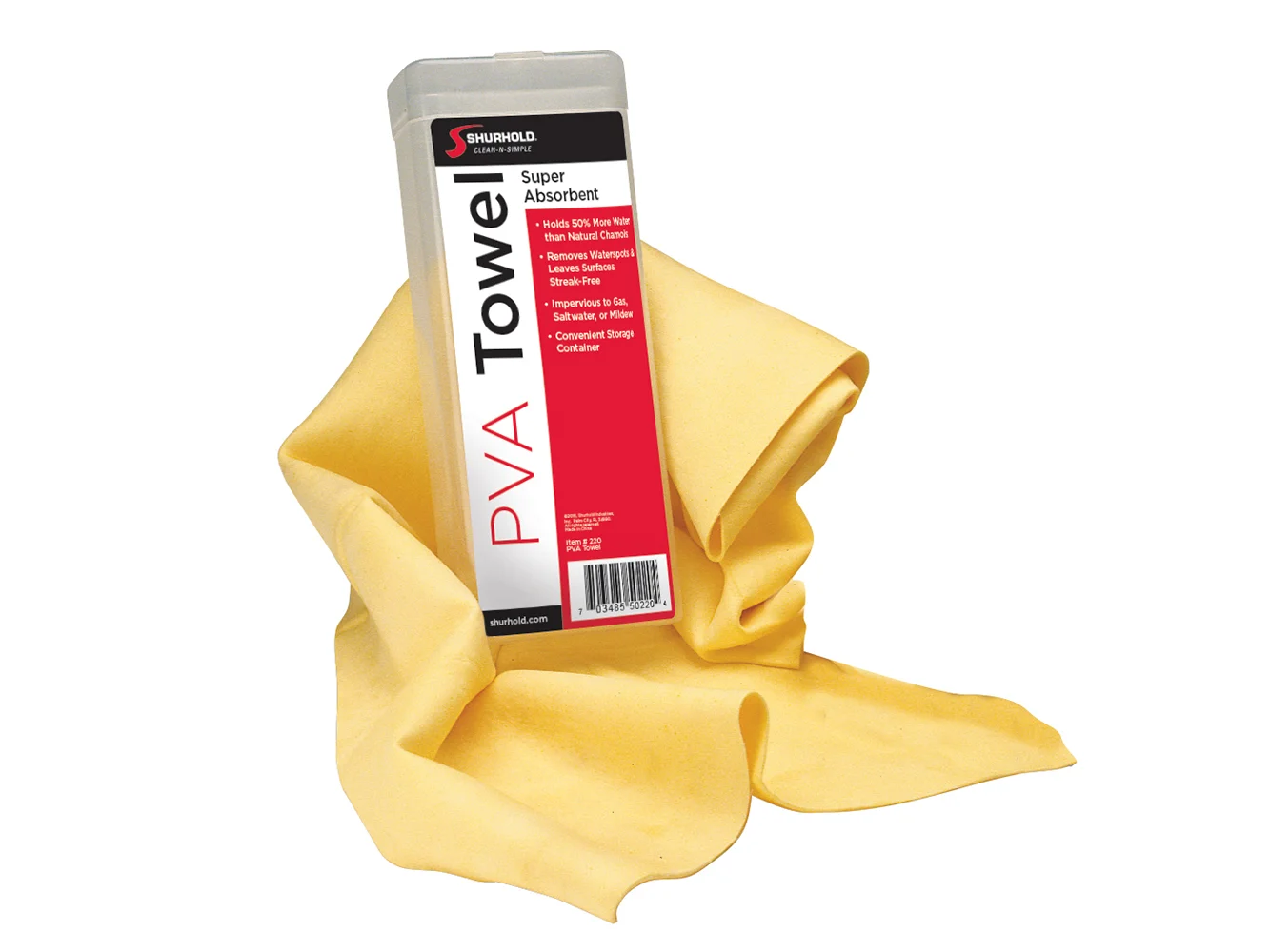 PVA towels absorb 50 percent more water than natural chamois, making for faster and more effective drying. The towels prevent water spots on all surfaces and come in an extra large size of 17″ x 27″ (43 cm x 69 cm).