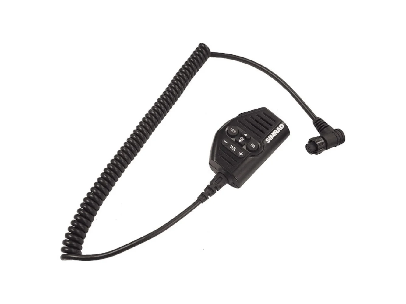 Simrad RS40 Remote Mountable Fist Mic. Can be connected to the front or rear of the radio, and an optional extension cable allows the radio and mic to be mounted in separate locations.