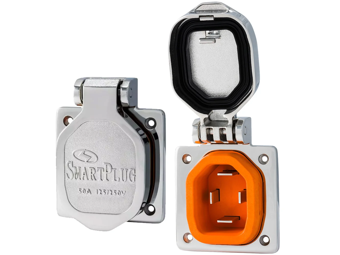 SmartPlug’s 50 AMP 125/250 V inlets provide 20X’s more electrical contact area eliminating the overheating conditions seen with twist-type connectors. The solid sleeve connection and weatherproof seal makes it a preferred option. The mounting flange holes match existing inlets so it can be easily installed to replace the old twist-type inlet products in minutes.