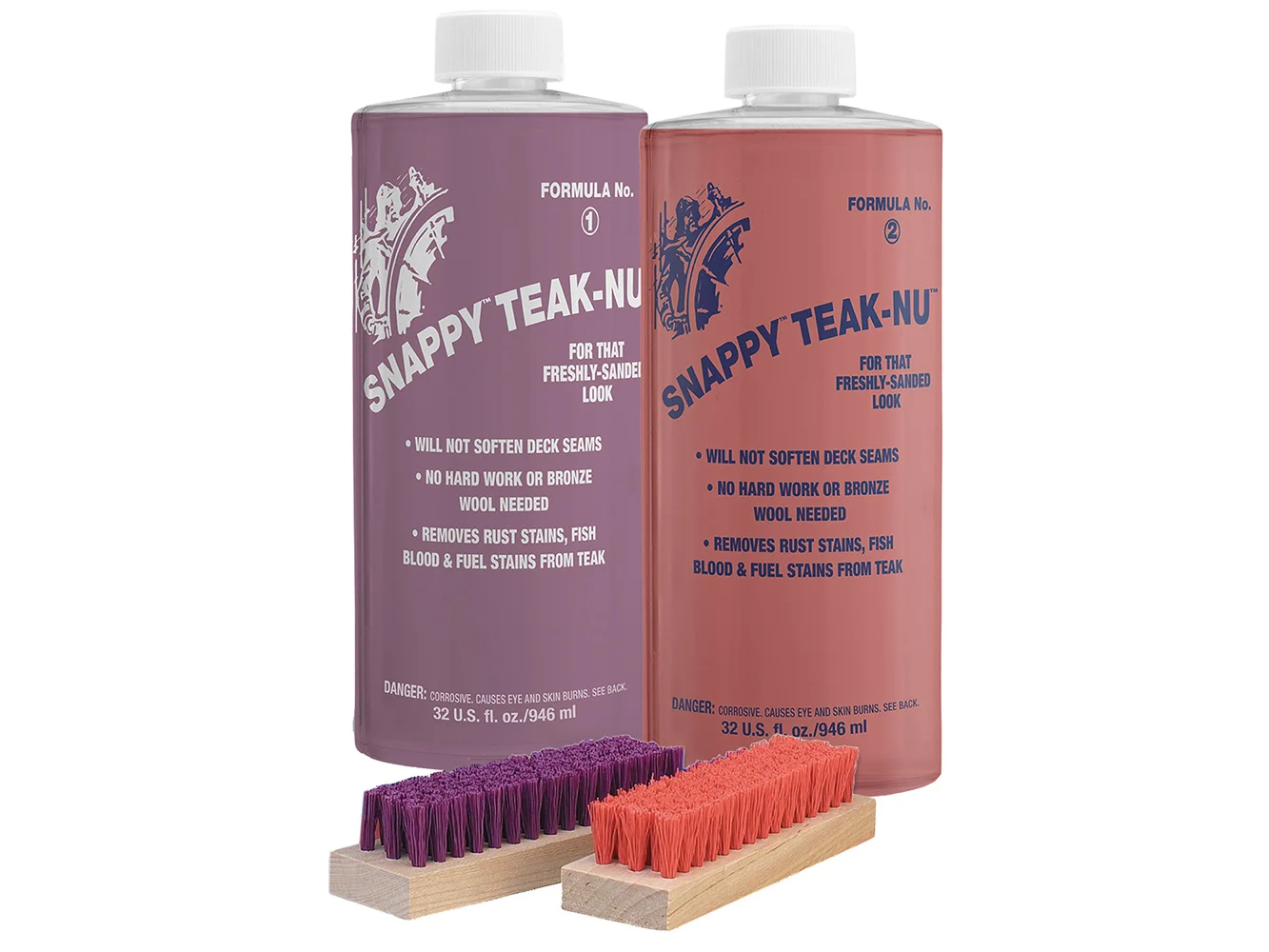 Snappy Teak-Nu Formula No. 1 must be used with Snappy Teak-Nu Formula No. 2 to achieve best results. For badly soiled, oiled, or coated teak: 1. Wear protective gloves. 2. Apply Formula No. 1 directly to wet deck using a medium bristle brush, spreading evenly across the area to be treated. When the treated area darkens to a uniform dark brown, use a coarse bristle brush to scrub lightly. 3. Apply Formula No. 2 evenly and scrub lightly to remove dirt. 4. Rinse brushes thoroughly after use.