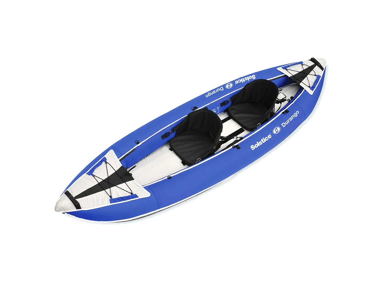 11′ x 37.5″ – The Solstice Durango 1-2 Person Inflatable Kayak is a multi-sport kayak that can easily convert from a 2 to 1-person kayak by simply removing one of the included seats. Built with a heavy-duty inner bladder and a nylon fabric reinforced cover – the Durango is a strong and durable kayak ready for any adventure. It’s 3-chamber design and high-pressure floor gives it a 440 lb capacity. Comes equipped with 2 grab handles, screw-style drain valves, front & rear spray covers, storage bungees, velcro paddle-holders, and 22 reinforced D-Ring tie-down locations. The Durango comes with a removable skeg for ultimate tracking when paddling.