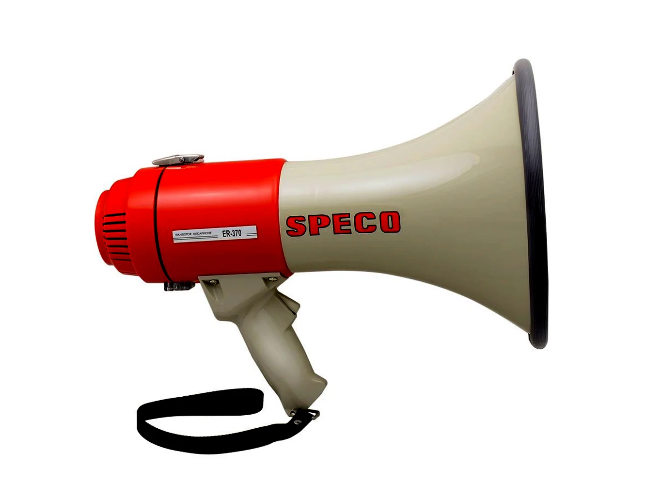 Our 16 watt deluxe megaphone features a built-in switch selectable electronic alarm siren, pistol grip, press to talk switch, volume control, and shoulder strap. It is weatherproof. It uses eight C-batteries, which are not included.