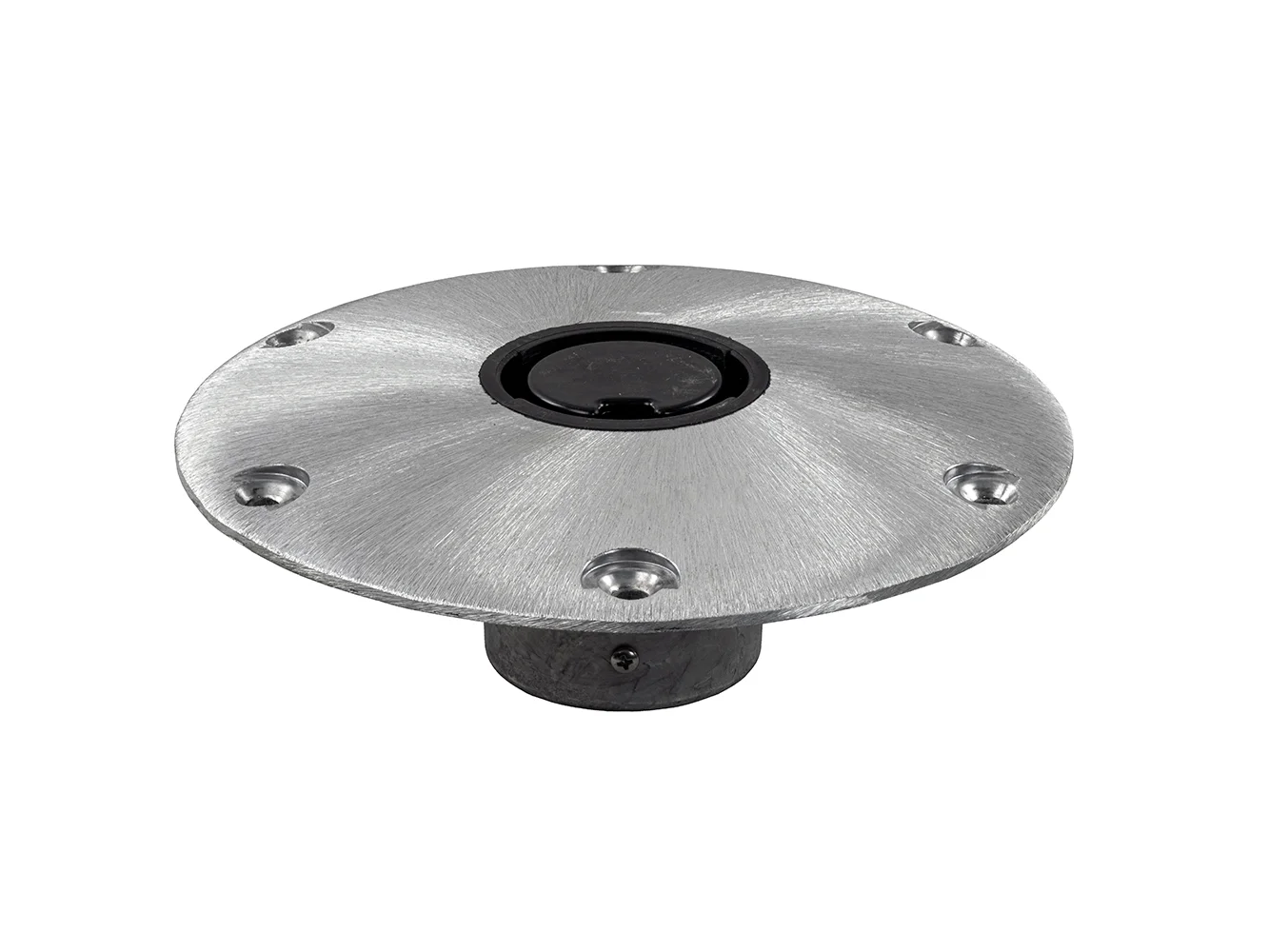 9″ Round Base With 8″ Round Hole Pattern. Satin Finish, High-Strength Aluminum. Below The Deck Mount, Requires 3-3/4″ Hole In Deck. Use With Any 2-3/8″ Plug-In Post (sold separately).