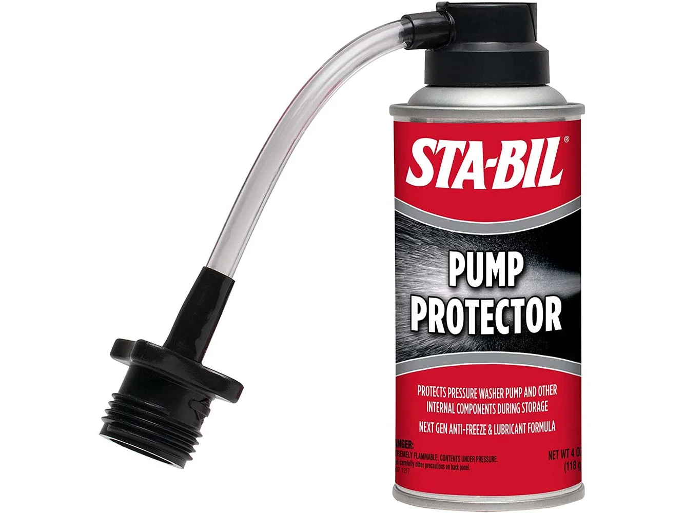 This product is great for protecting pressure washer pumps during storage as well as keeping pistons and seals fresh during the season for easy trouble-free startups. It is simple to use and takes seconds to protect your investment. The next-generation anti-freeze and lubricant will protect your pressure washer pumps 24/7. Screw the pump protector onto the water hose inlet of the pressure washer, with the pressure washer wand disconnected. Push down on the STA-BIL Pressure Washer Pump Protector trigger and hold until you see foam come out the side the wand connects onto. Your pressure washer is now lubricated and any standing water has been pushed out.