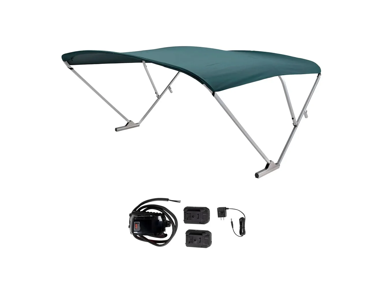 Battery Powered Bimini – Clear Anodized Frame & Green Fabric
