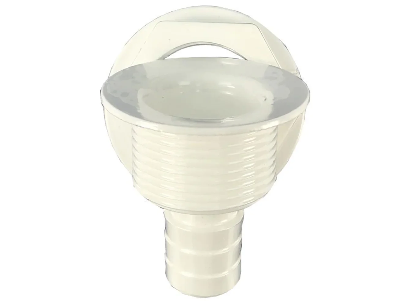 1-3/8″ White Concaive Head Drain. These molded drains, available in straight and 90-degree versions, offer a low-cost method to drain water from virtually anywhere. They have a very low-profile concave head to allow complete drainage. Drains mount easily in a 1-3/8″ diameter hole and are secured with the molded nut that is included. Hose barbs fit a 3/4″ hose for routing of drainage.
