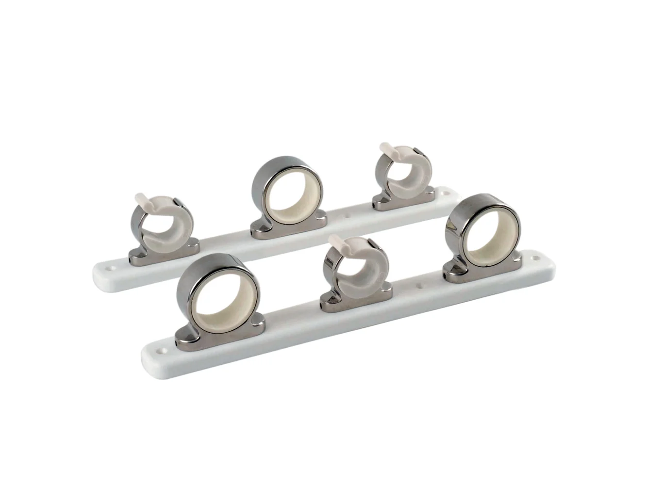 Rod-tip spring design securely locks rods in position. Easy to install UV-stabilized polyethylene racks. Pre drilled recessed mounting holes and beveled edges for clean, attractive look.This product may not be returned to the original point of purchase. Please contact the manufacturer directly with any issues or concerns.
