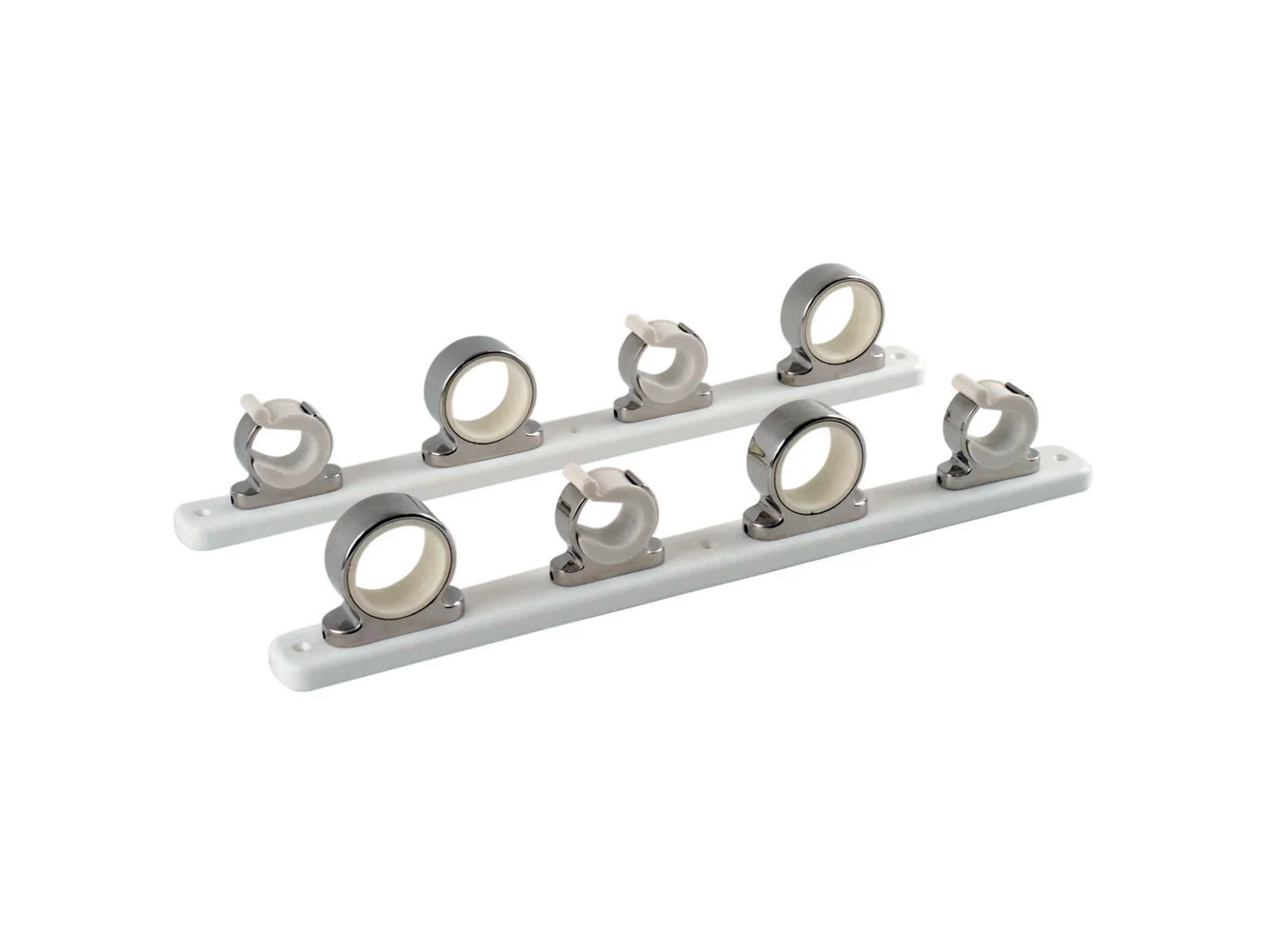 Rod-tip spring design securely locks rods in position. Easy to install UV-stabilized polyethylene racks. Pre drilled recessed mounting holes and beveled edges for clean, attractive look.This product may not be returned to the original point of purchase. Please contact the manufacturer directly with any issues or concerns.