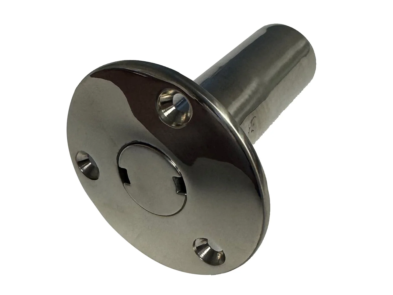 A high-polished, marine-grade (Type-316L) component used in boat hardware for securely holding items like fishing rods or poles at a fixed 90-degree angle, featuring a J-Lock system for easy, locked setup, often found on T-tops and hard tops for boating accessories.