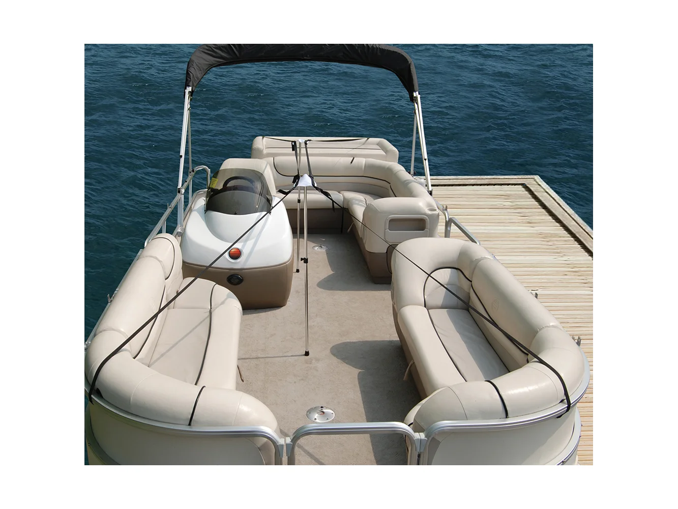 Extend the life of your pontoon boat cover by preventing water from pocketing. This easily installed system includes two adjustable support poles (bright dip anodized-snap ends). Poles adjust from 27″ to 50″ maximum height. 60ft of 1″ polypropylene webbing, quick release adjuster buckles and four injection molded hooks to secure to decking.