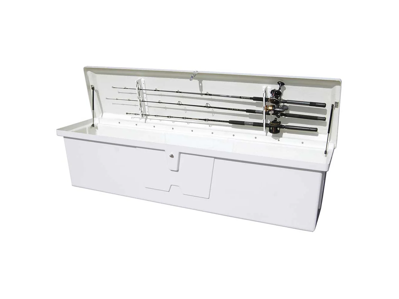An edition to Taylor Made’s line of dock boxes comes the ideal fisherman’s storage dock box. This box has all the features and benefits of our standard fiberglass dock boxes with the addition of rod holders on the underside of the lid. This added feature is a great way to keep your fishing poles stored and easily out of the way of all your other boating gear. Easily accommodates poles up to 7′ long.