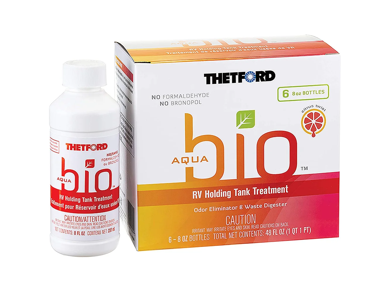 AquaBio , a twist on RV holding tank treatments, offers today’s RVers a Formaldehyde and Bronopal Free formula. Thetford’s next generation of holding tank solutions is campground friendly and complies with California regulations. The quick-acting holding tank treatment eliminates odors while digesting waste and toilet paper to prevent clogging, all without any harsh chemicals. Proudly made in the USA, Thetford’s New AquaBio is formulated and tested safe for all RV toilets, holding tanks and septic systems.