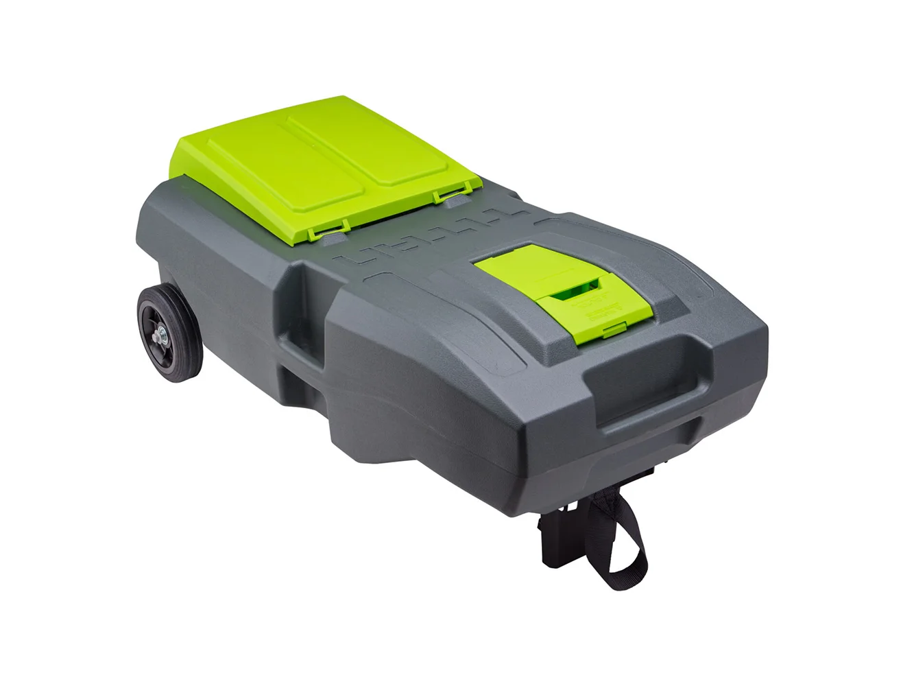 21-gal capacity portable waste tank with 2 wheels and ladder hook.
