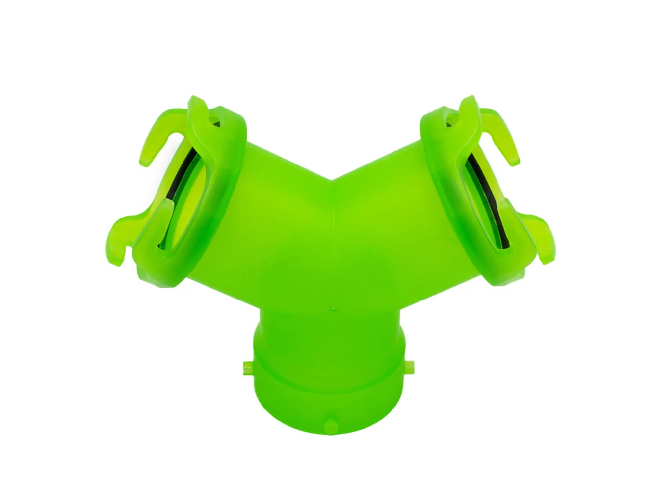 Translucent adapter connects two waste holding tanks for easy emptying into a single dump port.