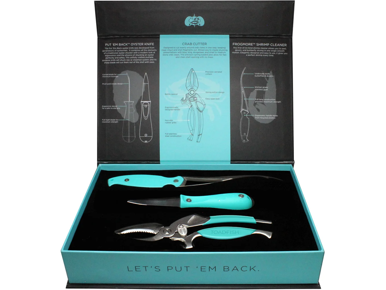 The Toadfish Coastal Kitchen Collection combines the most innovative seafood tools on the market into one set. The patented designs make preparing coastal food easier, safer, and more enjoyable. Toadfish created the Coastal Kitchen line to enhance the coastal lifestyle and provide a connection point between what we eat and the sustainability of those resources.