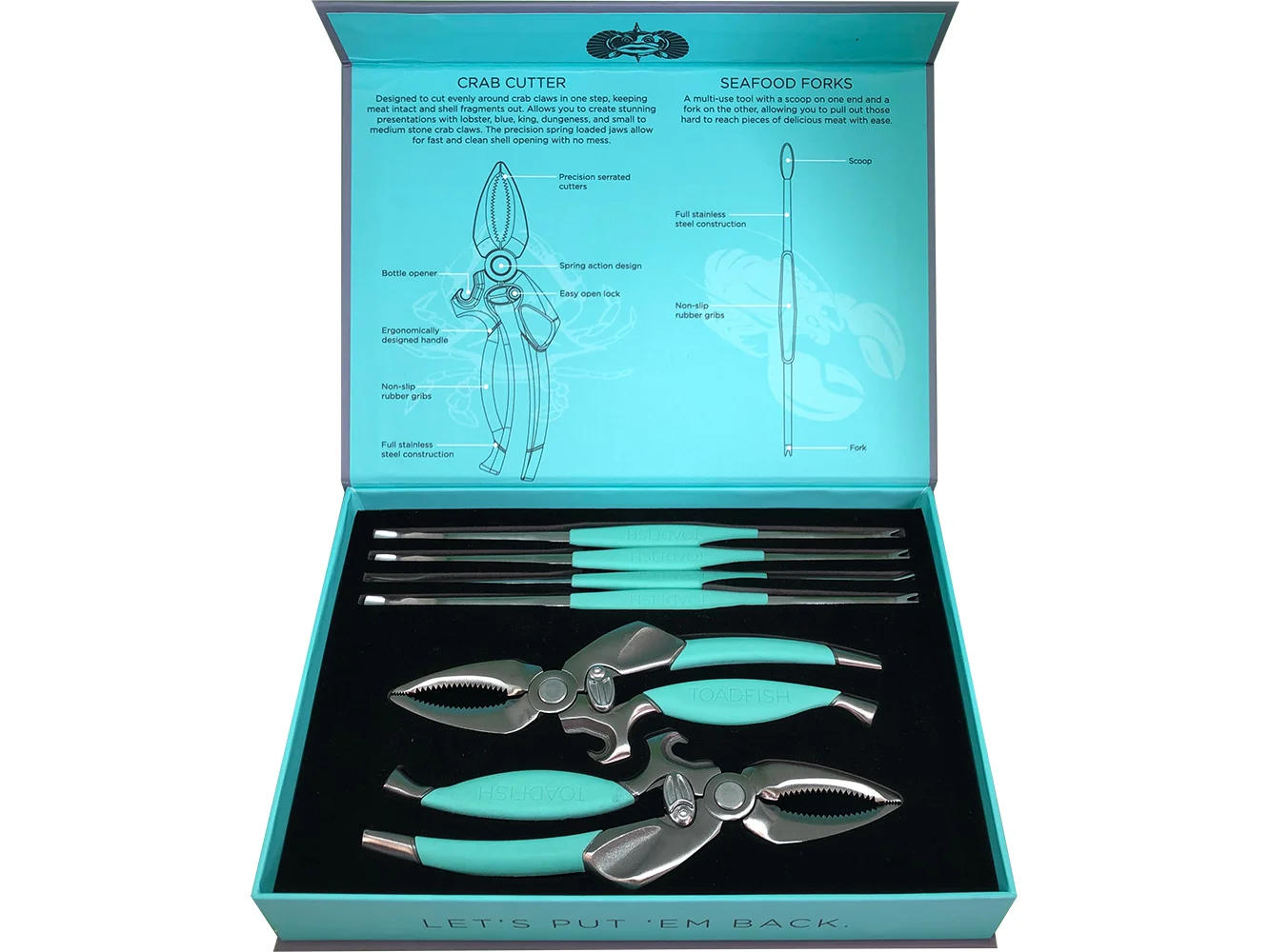 The most innovative crab and lobster tools on the market. Everything you need to open and enjoy fresh, hard-shelled seafood without the mess. Also, for every product sold, Toadfish will replant new oyster beds to help clean our coastal waters. Let’s Put ‘Em Back.